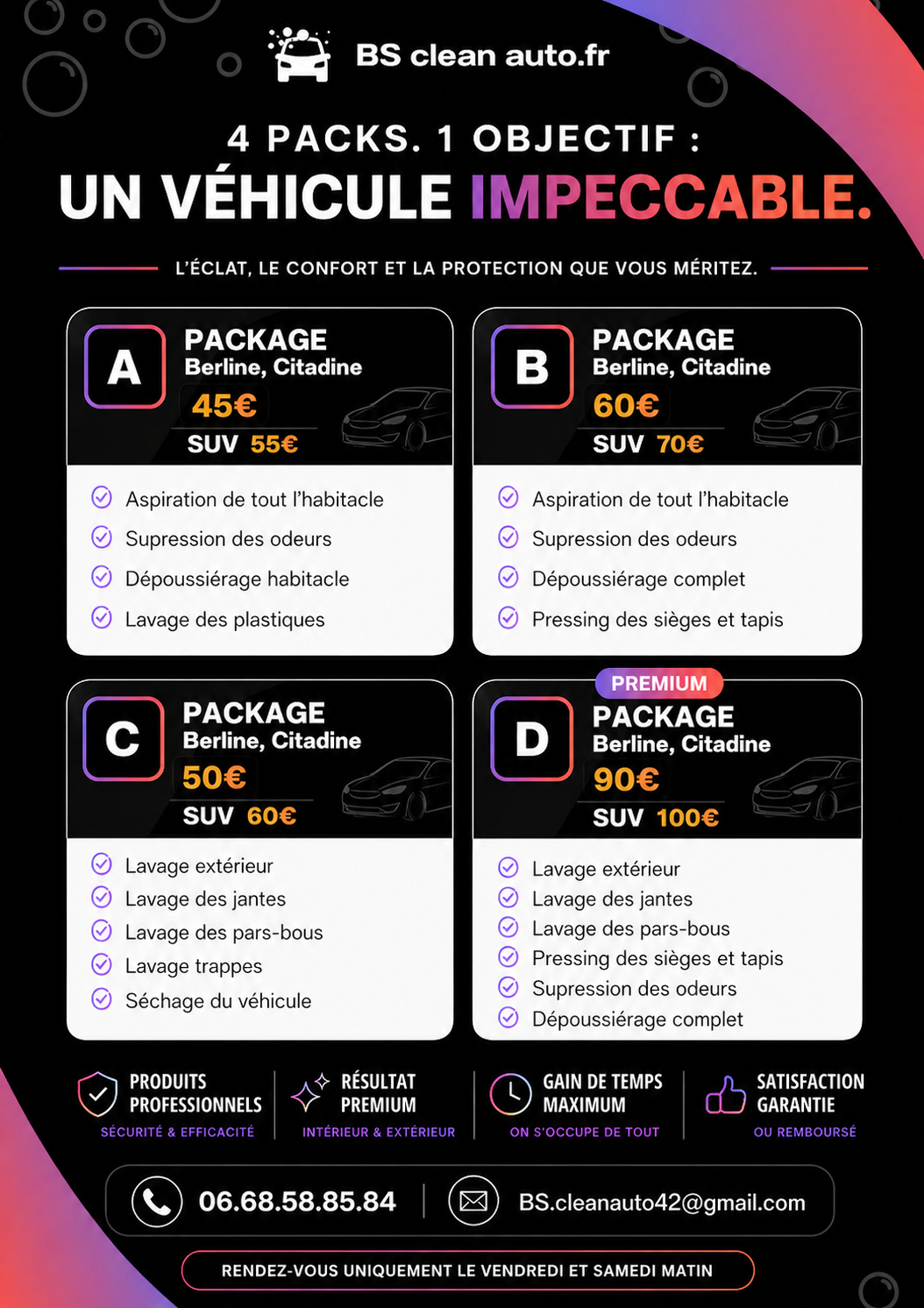 Nous proposons quatre packages différents pour répondre à vos besoins spécifiques de nettoyage, couvrant à la fois l'intérieur et l'extérieur de votre véhicule. Chaque package est conçu pour offrir un nettoyage complet et de qualité, adapté à vos exigences.